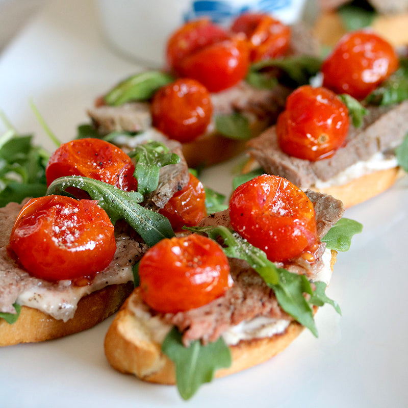 4. Spread 1 side of each crostini with horseradish ricotta. Top with arugula, beef and blistered tomatoes.