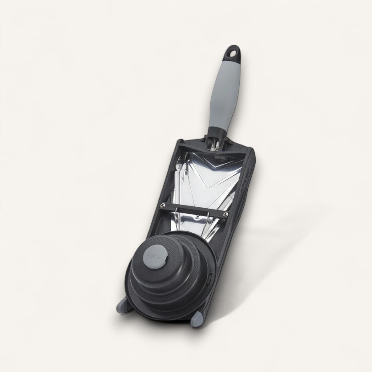 Stainless steel and polypropylene, professional quality blade. The new "Click Express System" quickly, safely and efficiently allowing to cut extra-fine slices from 0.2 mm to 5 mm. (space of 0.2 mm. The blade easily penetrates into the product. Micro-serrations of the blade make it easier to cut all fruit/vegetables into very thin slices while preserving the constitution of their flesh.