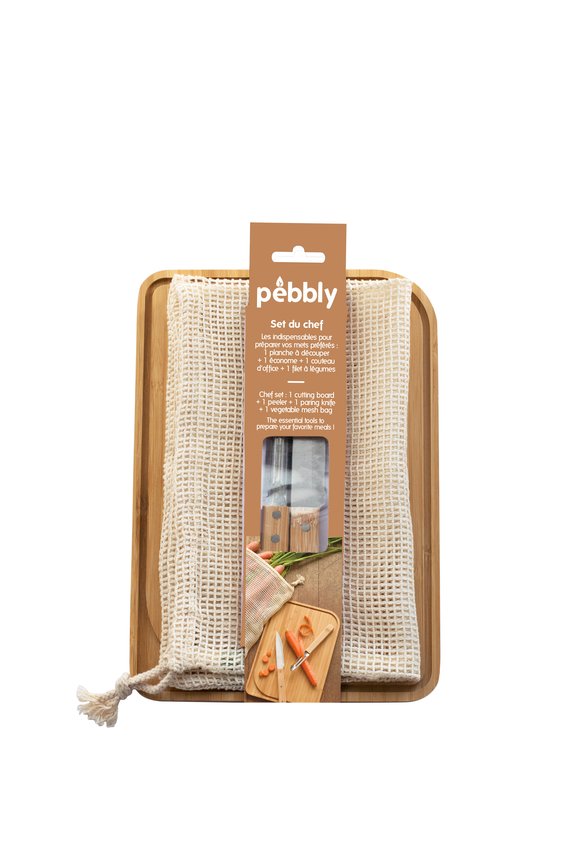 A well rounded kitchen kit begins with simple, dependable tools, and this Pebbly Chef Set gathers four of them in one place. The natural bamboo cutting board offers a sturdy surface with a channel that catches juices as you prep. A matching paring knife and peeler, both fitted with comfortable bamboo handles, make quick work of fruits and vegetables, whether you are trimming herbs, peeling apples, or prepping produce for the week.